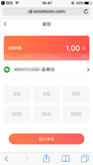 钱坊试玩即可赚奖励,提现门槛也比较低,用户只要满10元收益,就可以申请提现到你的微信钱包,提现无压力。