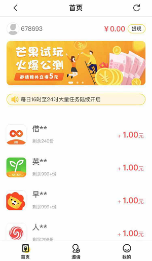 芒果试玩app,一款可以通过试玩应用赚钱的苹果试玩平台。最快只需三分钟的时间,即可完成一个任务,海量的好玩应用,你可以尽情的试玩体验。简单到极致的操作步骤,无论你是小白还是什么,你都可以轻松的上手搞定。只要利用好日常的碎片时间,你一天就可以轻松的赚到零用钱。喜欢的小伙伴,赶紧来下载一波吧。