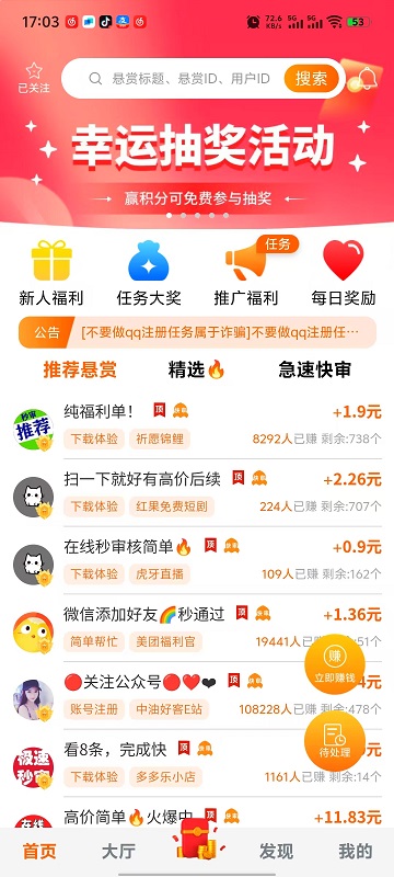 2、 平台任务多,各种的任务任你挑选,可在大厅选择任务类型。