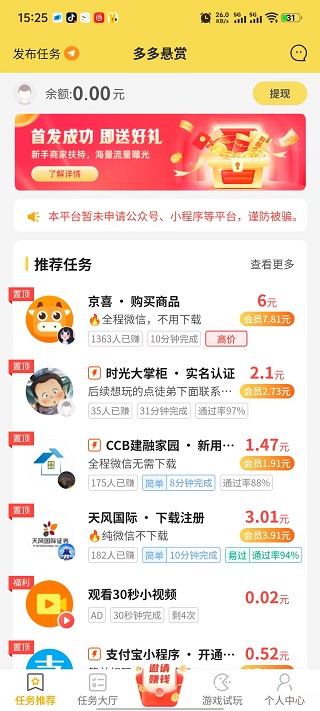 1、 多多悬赏,悬赏任务多多,注册享新手专属任务。