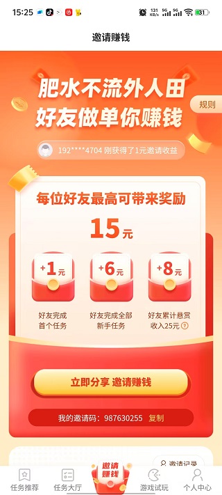 5、 邀请赚钱,每邀请到一位好友最高给你带来15元的红包收益。