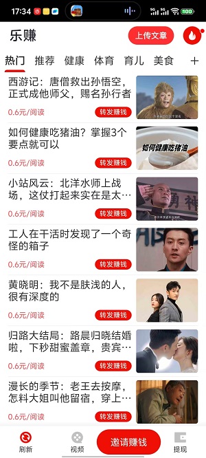 2、 阅读平台的文章,分享好看的资讯被阅读单价/0.6元。