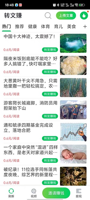 转文赚是一款可以看资讯,转发资讯赚奖励的app。内置众多的好文好章,用户可以随心的进行阅读,看到许多的有趣好文。且平台每天还持续的更新,让你看到最新鲜的资讯内容。当你在里面看到好看的文章,你还可以进行转发,只需转发获得阅读,那么你就可以获得阅读奖励。边看文章边赚奖励,适合喜欢阅读的小伙伴,赶紧下载试一试吧。