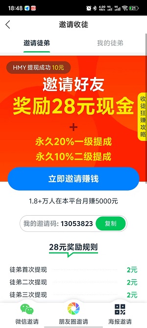 5、 邀请收徒,邀请到一位有效徒弟,得28元+30%徒弟分成。